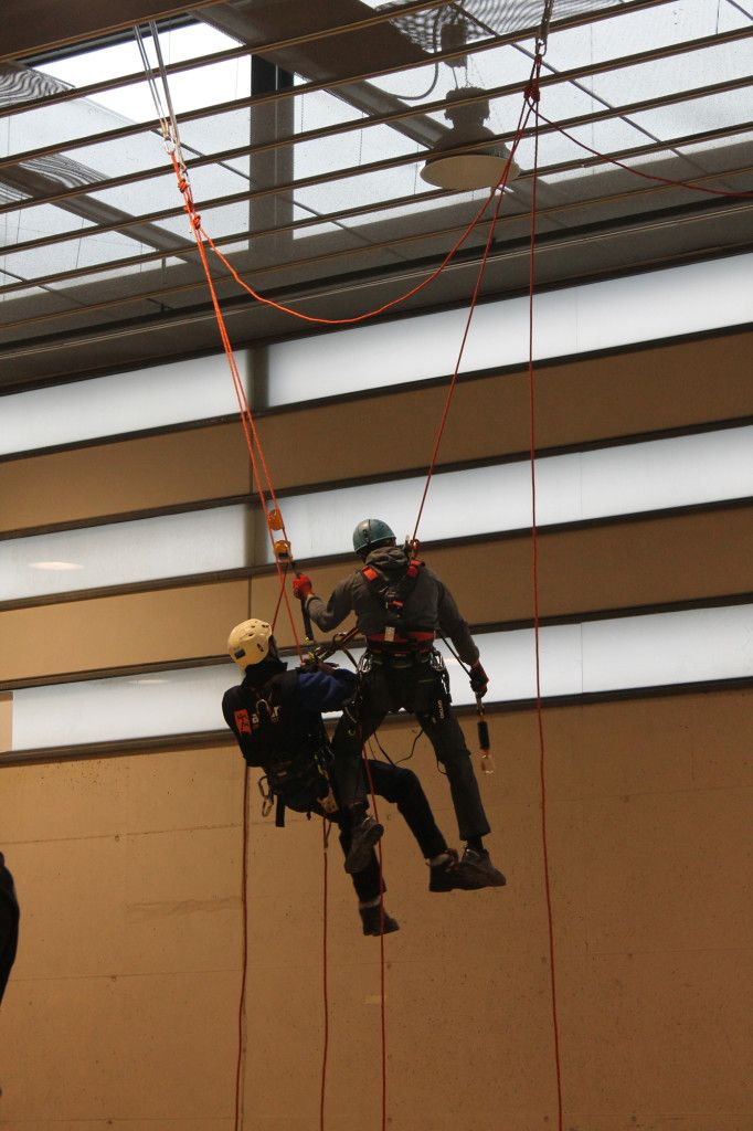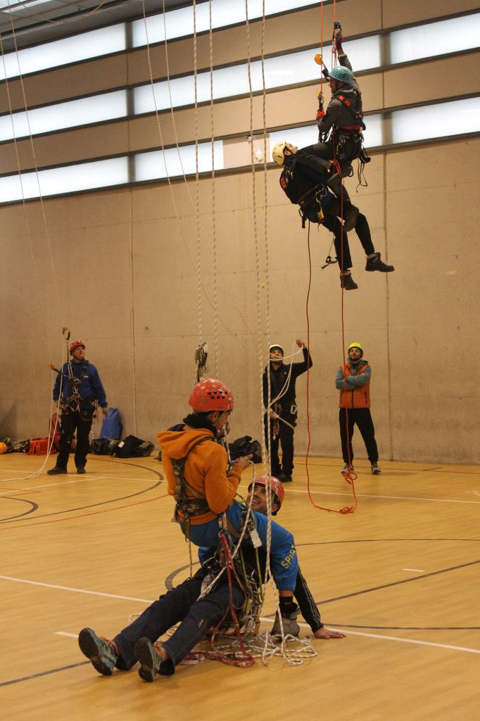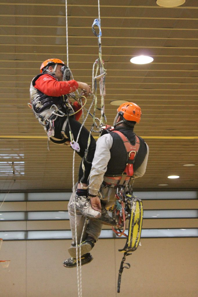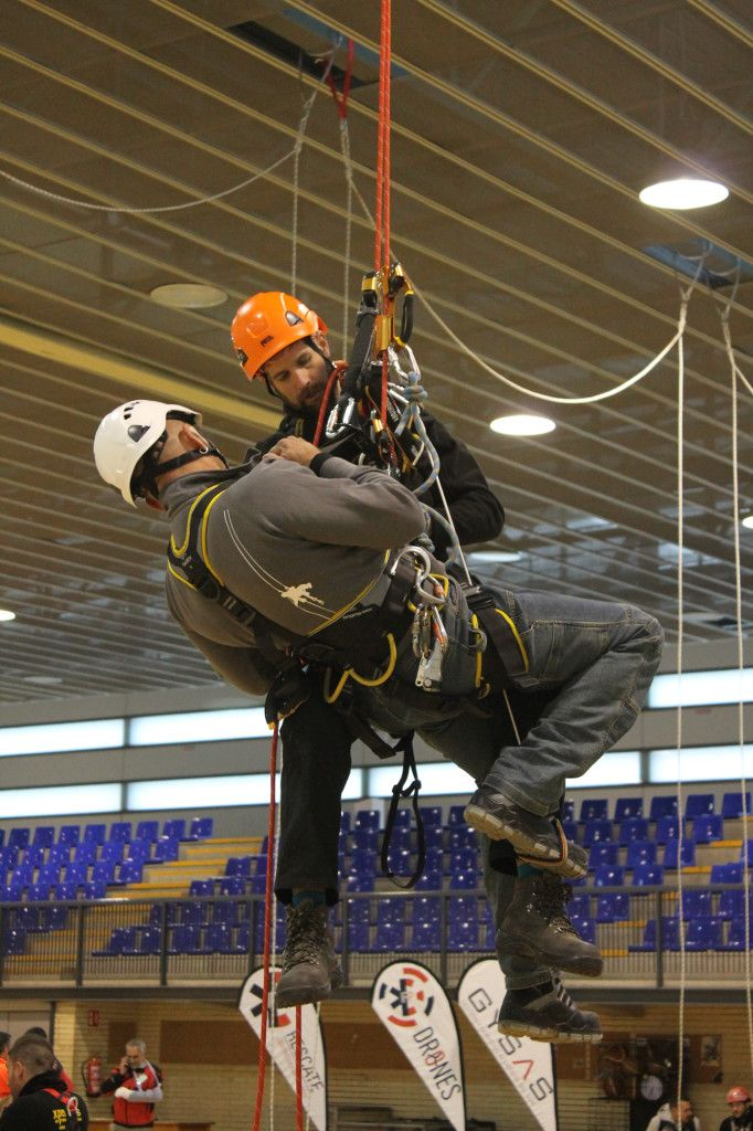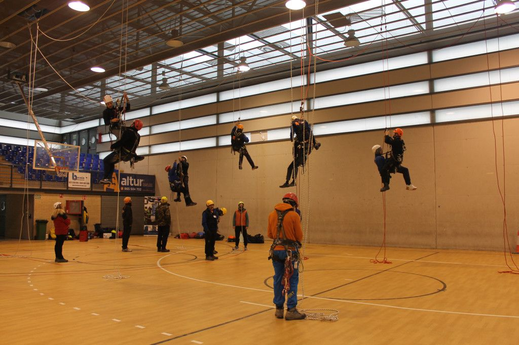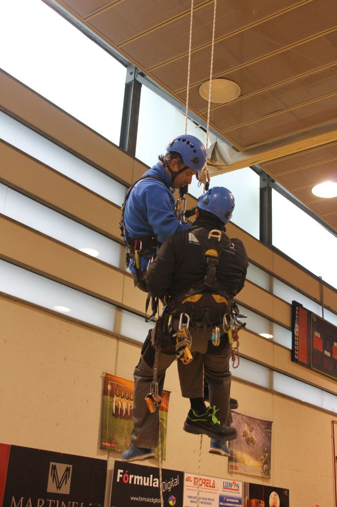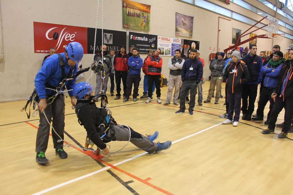 Tras un pequeño descanso en el que aprovechamos para ir a almorzar, tomaron la palabra los representantes de Bernia Verticales (Vicente y Basi) que nos estuvieron mostrando una técnica más de rescate para que luego pudiéramos ensayarla, y así sucesivamente una empresa tras otra nos fueron explicando técnicas que después poníamos en práctica.