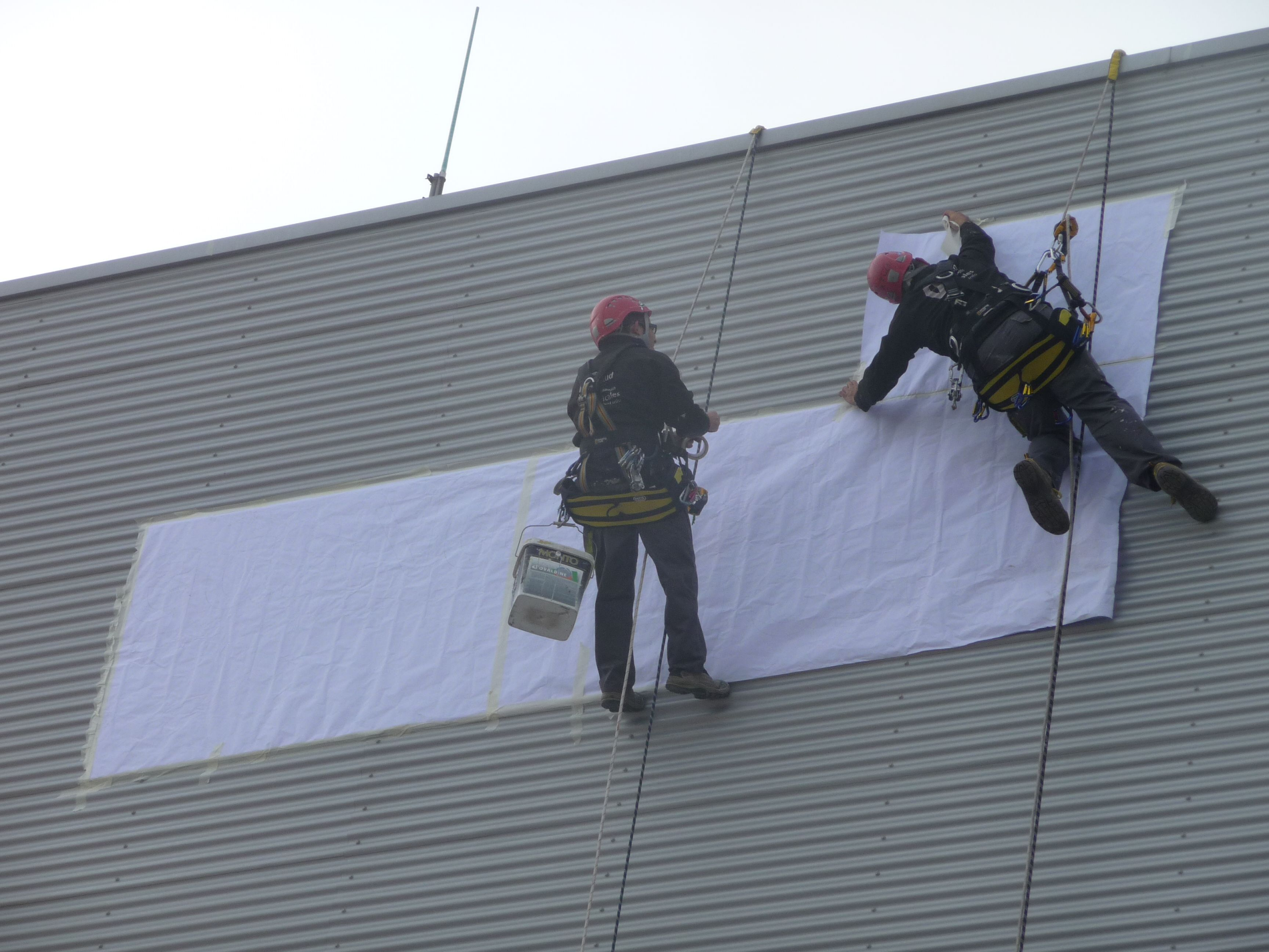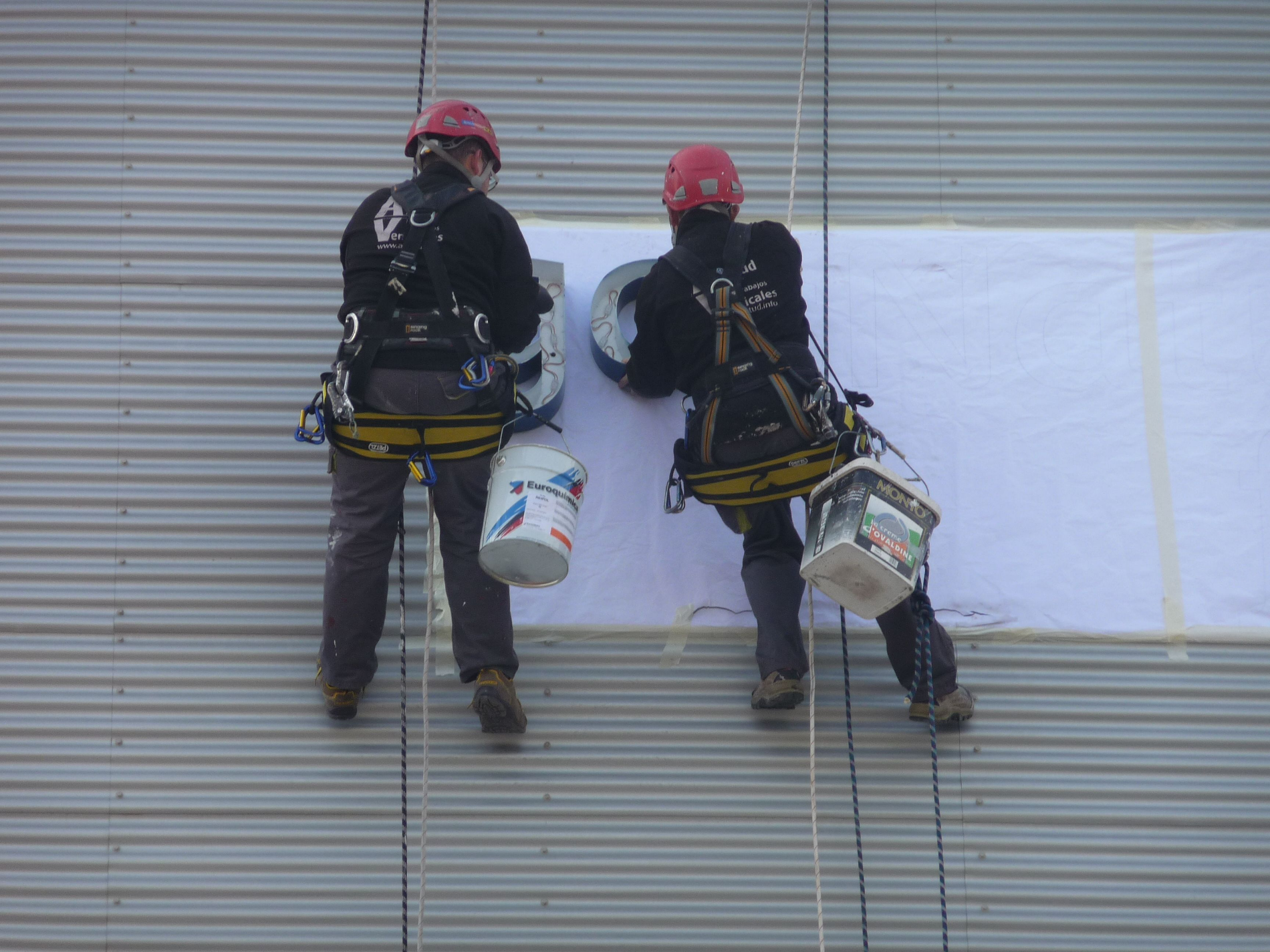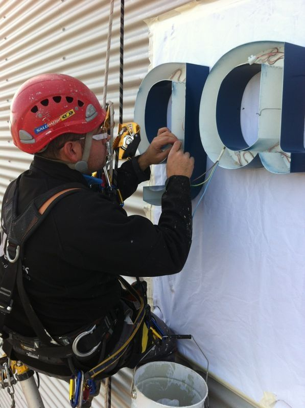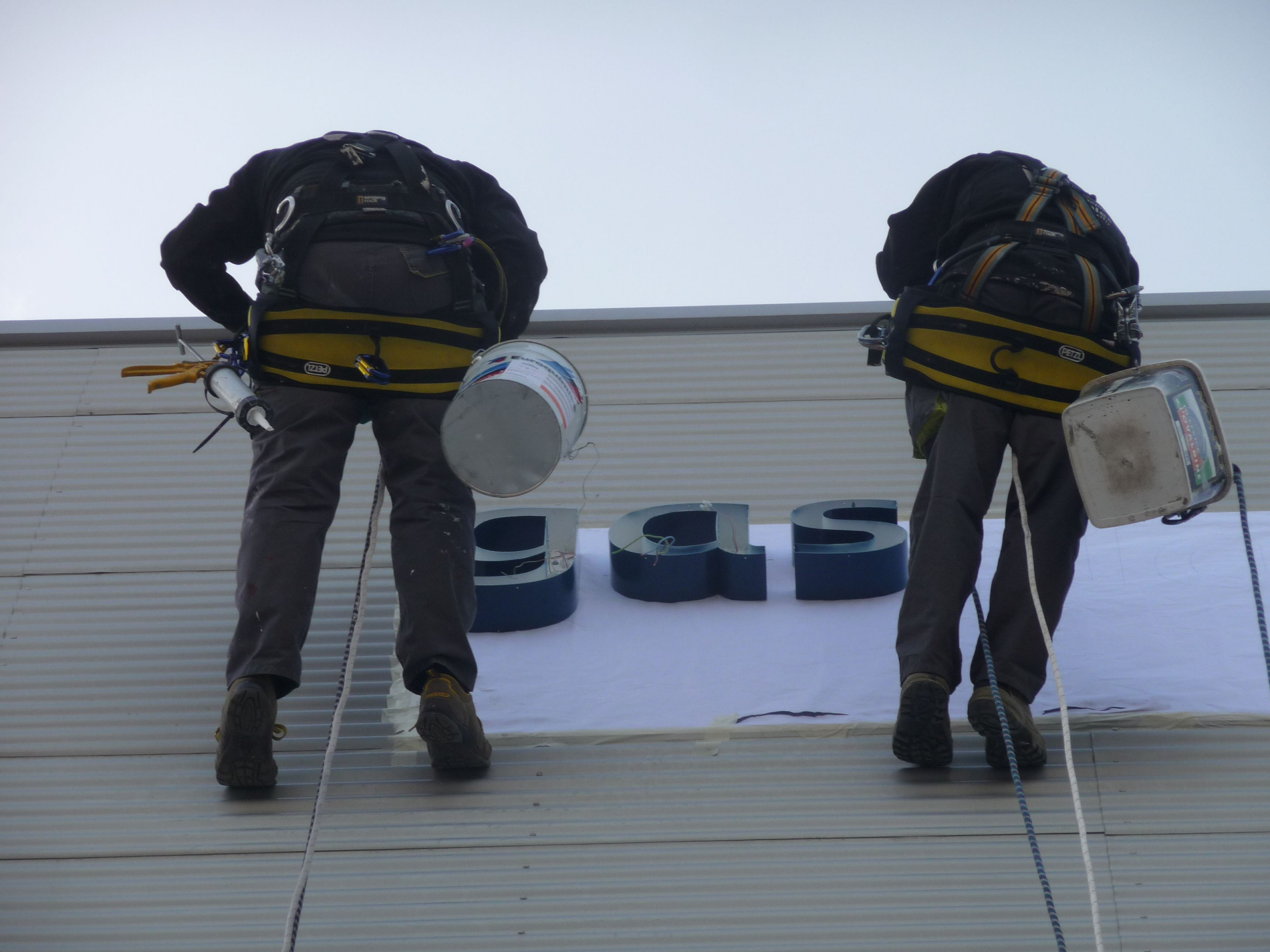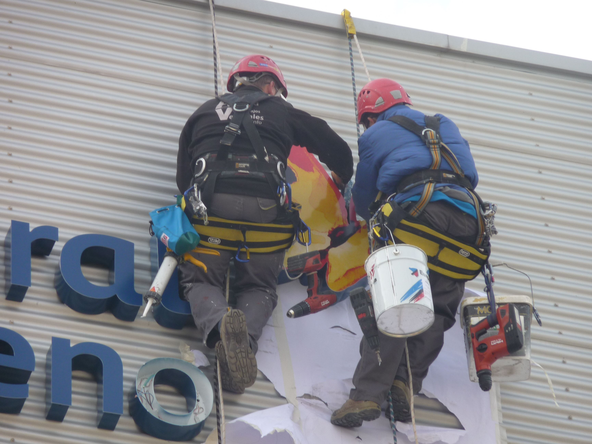 En principio el trabajo era fácil de realizar, eso sí, teniendo el título de instalador eléctrico y los conocimientos necesarios para poder realizar las conexiones eléctricas necesarias. Tras instalar los sistemas de trabajos verticales necesarios nos dispusimos a colocar la plantilla de papel necesaria para poder distribuir las diferentes partes del rotulo sin el mínimo error.