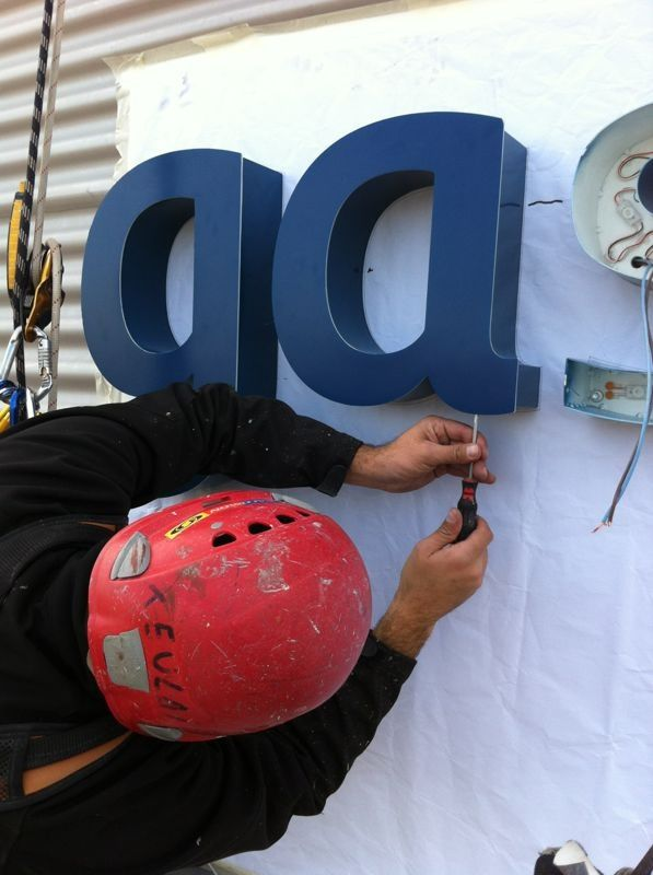 Acto seguido empezamos a colocar letra a letra todas las palabras que formaban el rotulo. Al mismo tiempo teníamos que ir haciendo la instalación eléctrica, cableado, iluminación, etc., para lo cual debíamos a su vez ir realizando las perforaciones necesarias para conseguir traer la toma de corriente desde el panel de eléctrico en el interior del edificio hasta la fachada.